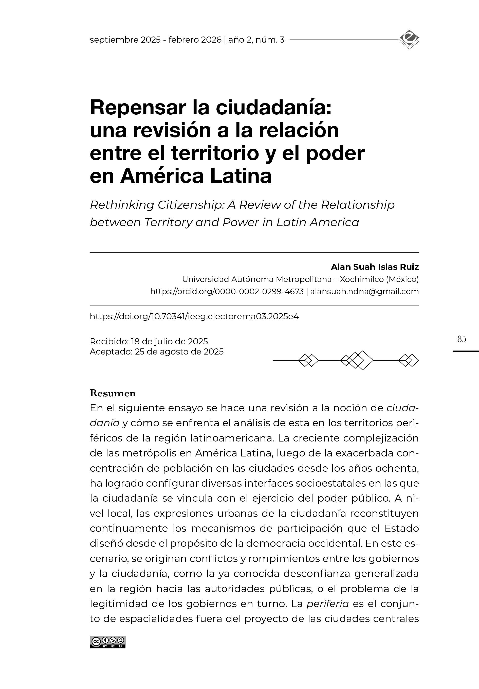 En el siguiente ensayo se hace una revisión a la noción de ciudadanía y cómo se enfrenta el análisis de esta en los territorios periféricos de la región latinoamericana. La creciente complejización de las metrópolis en América Latina, luego de la exacerbada concentración de población en las ciudades desde los años ochenta, ha logrado configurar diversas interfaces socioestatales en las que la ciudadanía se vincula con el ejercicio del poder público. A nivel local, las expresiones urbanas de la ciudadanía reconstituyen continuamente los mecanismos de participación que el Estado diseñó desde el propósito de la democracia occidental. En este escenario, se originan conflictos y rompimientos entre los gobiernos y la ciudadanía, como la ya conocida desconfianza generalizada en la región hacia las autoridades públicas, o el problema de la legitimidad de los gobiernos en turno. La periferia es el conjunto de espacialidades fuera del proyecto de las ciudades centrales donde se concentran los poderes políticos y económicos, y que al mismo tiempo originó relaciones sociedad-gobierno particulares, separadas del proyecto de ciudadanía liberal entendida como la campaña gubernamental que fomenta determinados valores y comportamientos políticos que se insertan en el discurso estatal de la educación y la cultura cívica.