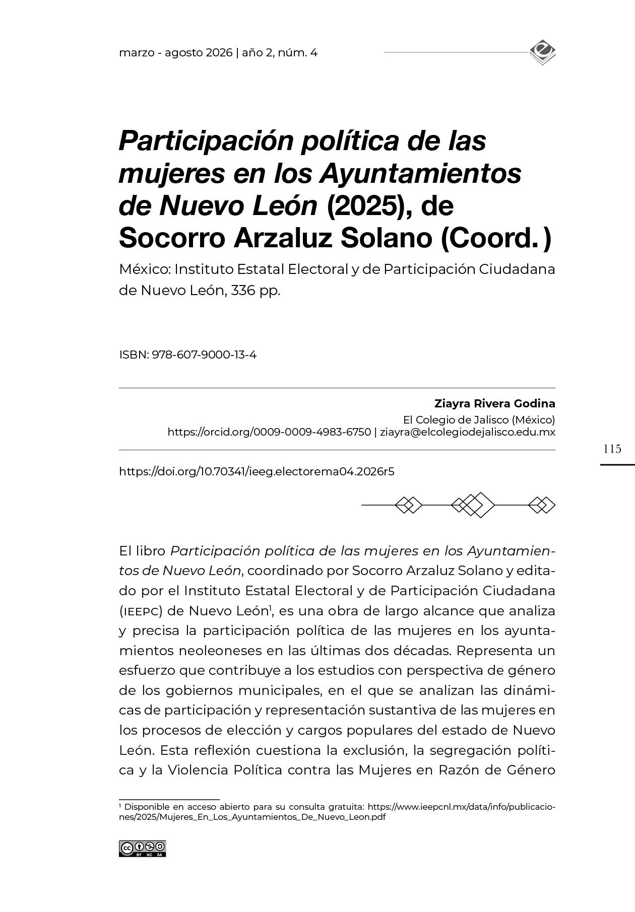 El libro Participación política de las mujeres en los Ayuntamientos de Nuevo León coordinado por la Dra. Socorro Arzaluz Solano, editado por el Instituto Estatal Electoral y de Participación Ciudadana de Nuevo León, es una obra de largo alcance que analiza y precisa sobre la participación política de las mujeres en los ayuntamientos neoleoneses en las últimas dos décadas.