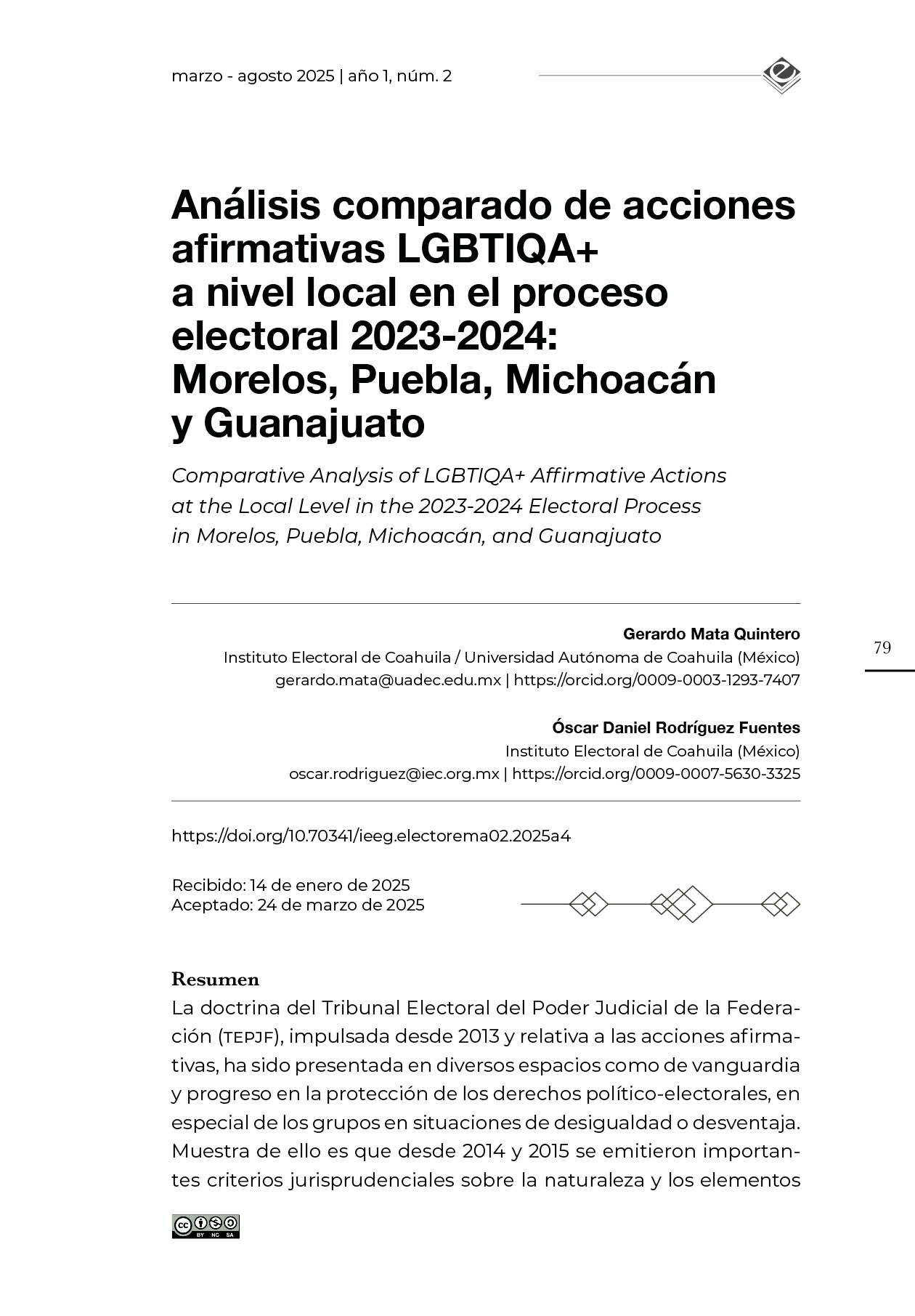 La doctrina del Tribunal Electoral del Poder Judicial de la Federación (TEPJF), impulsada desde 2013 y relativa a las acciones afirmativas, ha sido presentada en diversos espacios como de vanguardia y progreso en la protección de los derechos político-electorales, en especial de los grupos en situaciones de desigualdad o desventaja. Muestra de ello es que desde 2014 y 2015 se emitieron importantes criterios jurisprudenciales sobre la naturaleza y los elementos de esta figura jurídica, llegando a emitir la jurisprudencia electoral 1/2024 que hace explícito el deber de las autoridades de implementar medidas para la población LGBTIQA+, como garantía de sus derechos políticos. Frente a este discurso de progresión y garantía de derechos, el presente trabajo propone un ejercicio comparativo de las experiencias en las entidades federativas para la implementación, o no, de acciones afirmativas, específicamente en favor de personas LGBTIQA+, acciones que fueron judicializadas no sólo ante los respectivos tribunales locales, sino que ameritaron un pronunciamiento por parte de las Salas del TEPJF. El estudio aborda los casos de cuatro estados en el marco del proceso electoral concurrente 2023-2024, en el que los correspondientes órganos electorales diseñaron o fueron instados a crear una medida compensatoria para la comunidad LGBTIQA+: Morelos, Puebla, Michoacán y Guanajuato. Esta muestra permitirá contrastar el discurso de derechos frente a los comportamientos concretos de autoridades electorales, tanto administrativas como judiciales, así como de institutos políticos y sociedad civil, de forma que se dimensione cuán consolidada está la doctrina de las acciones afirmativas.